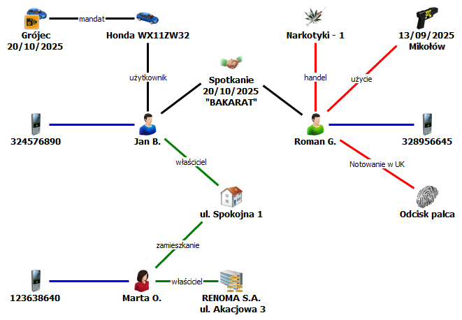 Rys. Przykładowy diagram powiązań oparty na danych testowych (fikcyjnych) – wykonany na potrzeby artykułu